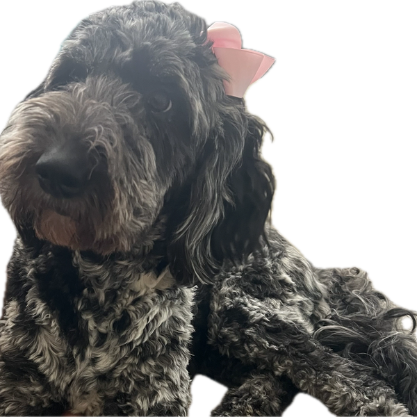 Oreo is our split-face goldenoodle (pictured above). We are anxiously waiting for her to complete health testing, so we can see her flourish as a mama She has a stunning Merle Coat,and is the sweetest girl!